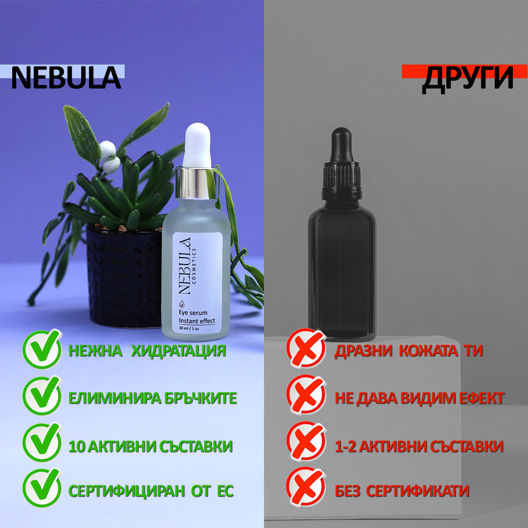 Околоочният серум с мигновен ефект на NEBULA COSMETICS е направен с една цел, а тя е да ви помогне да се оттървете бързо и ефективно от микробръчките под и около очите с помоща на активни съставки. Този високачествен серум е разработен от експерти в сферата на козметиката, за направата му еизползвана